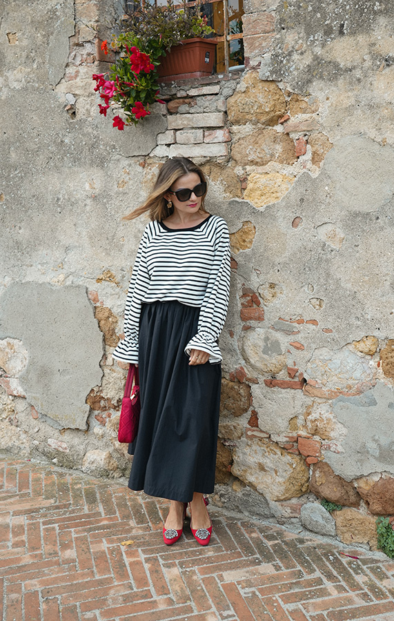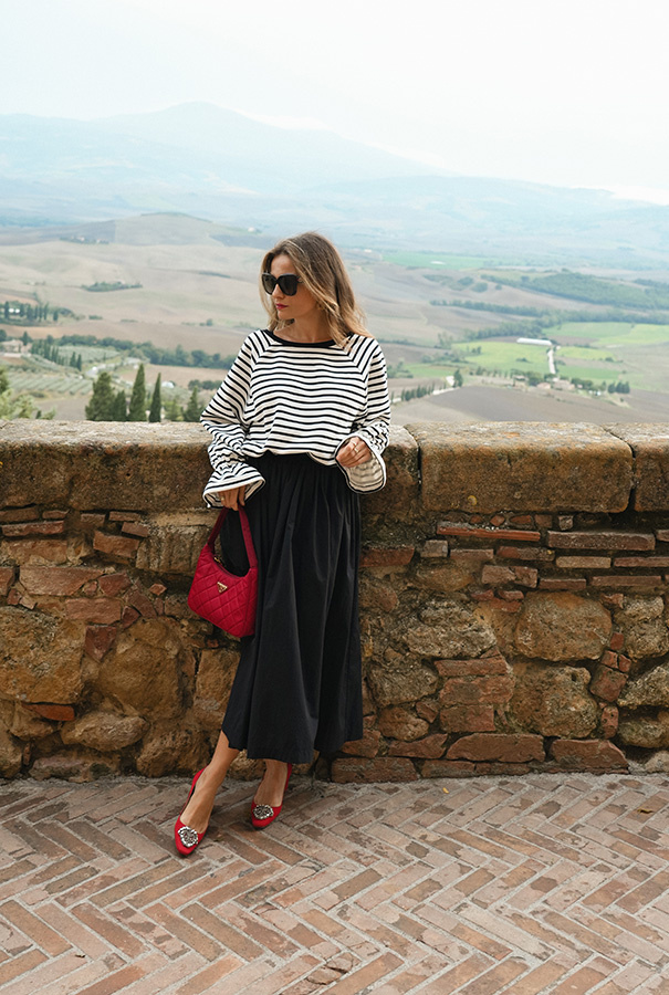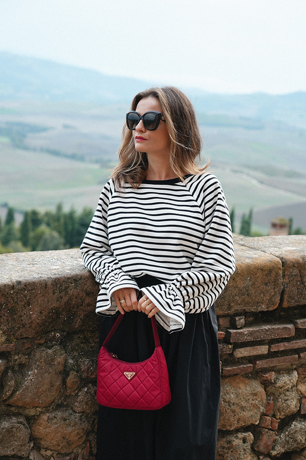 Bluza Maelle Noire o pudełkowym kroju z długim rękawem i delikatnie opuszczoną linią ramion to produkt, który dopełni wiele stylizacji. Wykonana jest z wysokogatunkowej, miękkiej i przyjemnej dla ciała bawełny w śmietanowej bieli z czarnymi paskami. Posiada oversizowy krój, który luźno układa się na sylwetce i zapewnia swobodę. Na dole znajduje się wiązanie, dzięku któremu można zaznaczyć talię i uzyskać casualowo-sportowy look. Delikatnie bufiaste, romantyczne rękawy dodają jej oryginalnego sznytu.