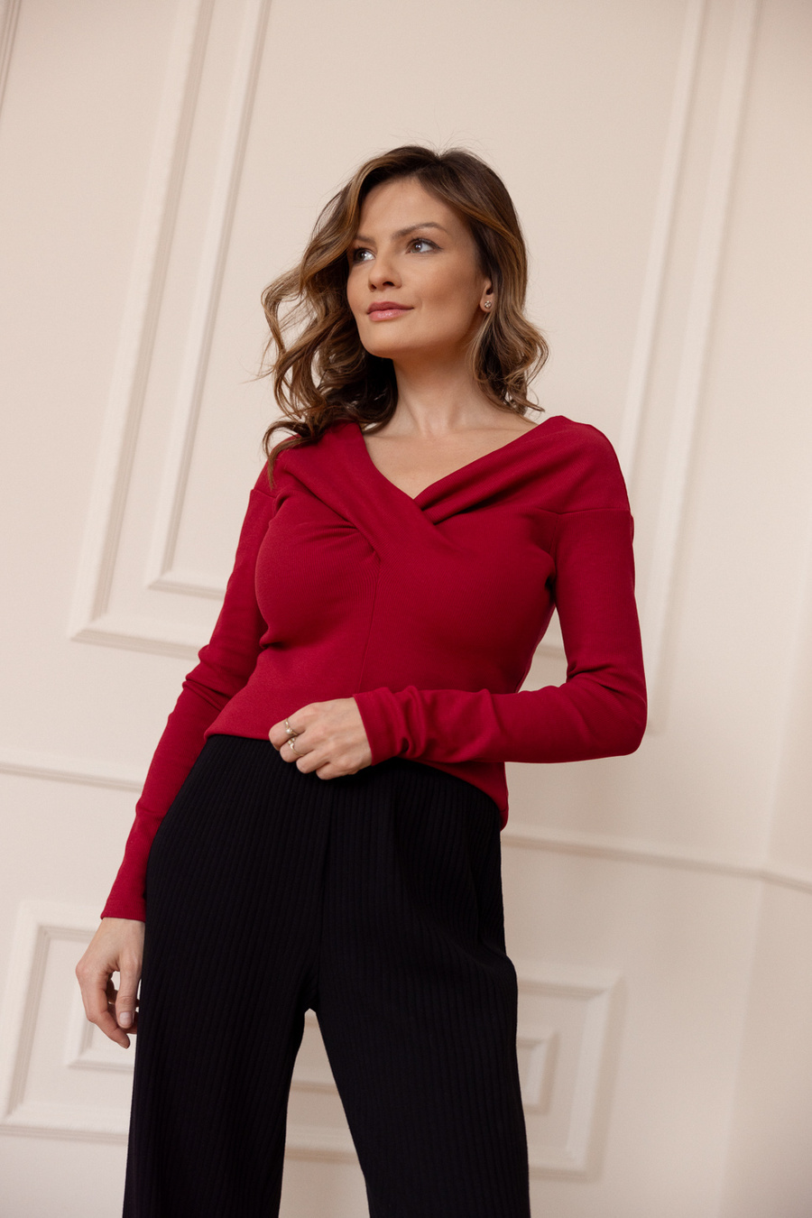 Bluzka Kelly z długim rękawem w pięknym odcieniu głębokiej czerwieni. Dopasowana bluzka z dekoltem carmen to jeden z gorętszych modowych trendów. Kelly Amour wykonana z wyjątkowej, mocno elastycznej i przyjemnej dla skóry tkaniny, która jest jak druga skóra. Materiał bardzo ładnie się układa i dostosowuje się do ciała. Kelly to klasyczna i niezawodna baza, która świetnie uzupełni każdą garderobę. Idealnie sprawdzi się zarówno do marynarki czy spódnicy, jak i do eleganckich spodni. Jest niezwykle kobieca - dekolt możesz układać na różne sposoby - odsłaniając go mocniej lub delikatniej, w zależności jaki efekt w stylizacji chcesz uzyskać.