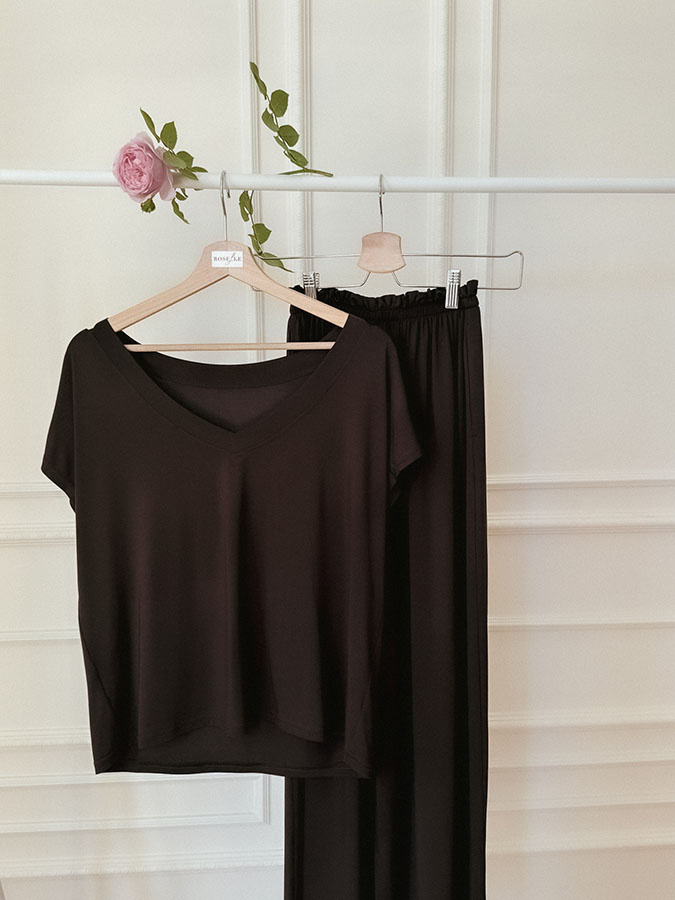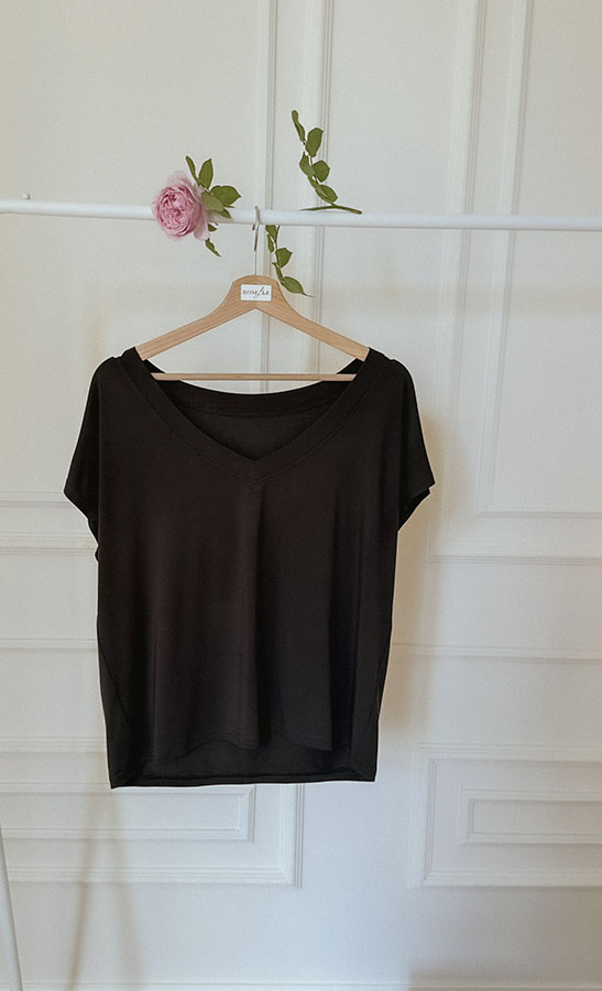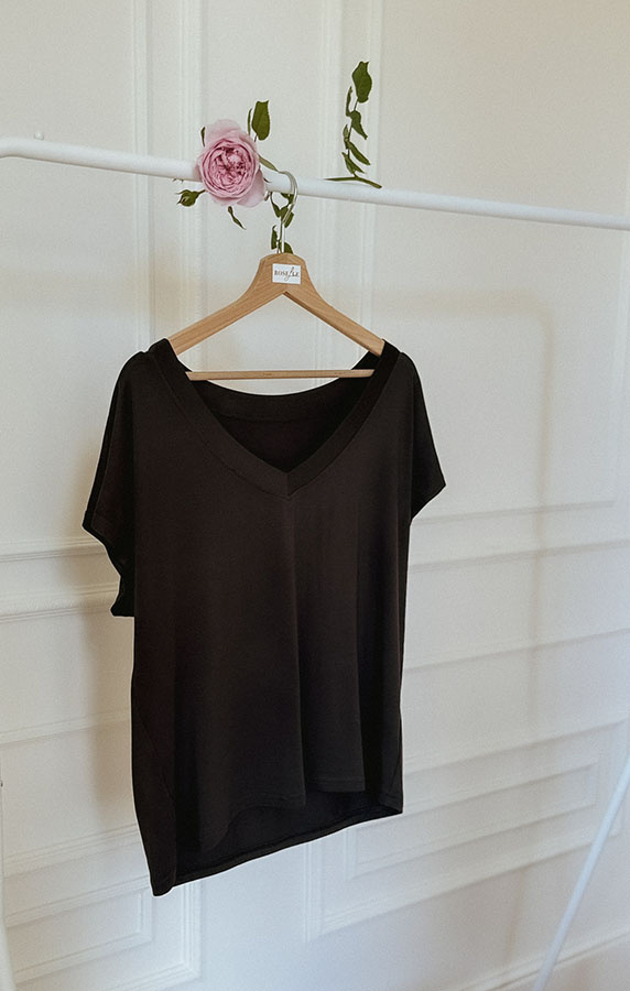 Bluzka o oversizowym kroju z pogłębionym dekoltem V, który przepięknie uwidacznia obojczyki i dodaje stylizacji niesamowitej lekkości. Dekolt V stworzony jest tak, aby można było nosić go zarówno z przodu, jak i na plecach. W bluzce Noelle Chocolate będziesz czuła się komfortowo i przyjemnie, dzięki wyjątkowej modalowej tkaninie z dodatkiem elastanu. Głęboki odcień czekolady, który wygląda szlachetnie, można zestawić z wieloma kolorami. To idealna propozycja na co dzień w ciepłe dni. Jeśli zależy Ci, aby zmienić jej charakter, załóż do niej odpowiednie dodatki.
