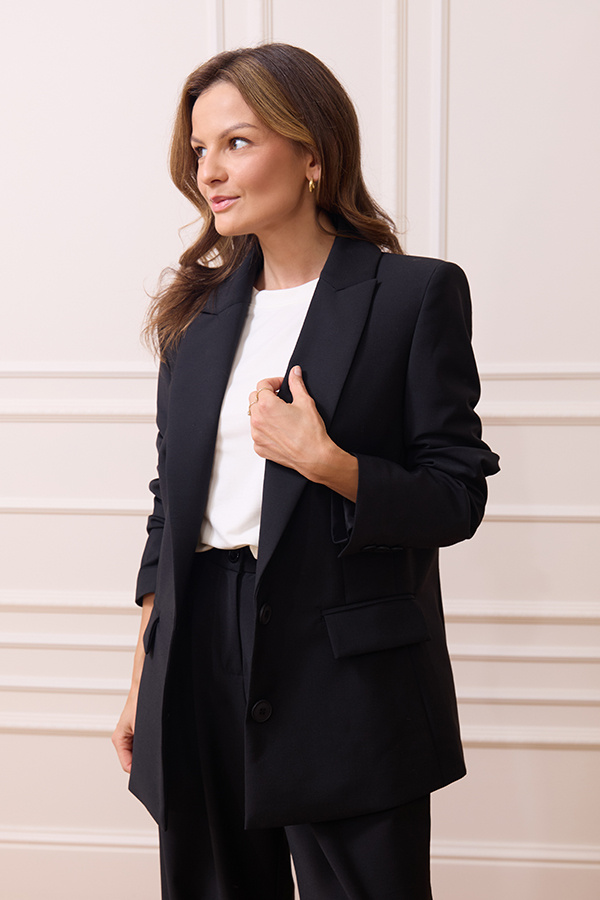 Nasz bestsellerowy fason Modena w klasycznej czerni. Elegancka marynarka o kroju lekkiego oversize'u posiada kieszenie, poduszki oraz tym razem - tylko dwa guziki. Ten głęboki kolor czerni jest nie tylko elegancki, ale także bardzo uniwersalny. Pasuje do różnych kolorów i wzorów, co czyni go doskonałym wyborem na wiele okazji. Marynarka wykonana z wysokiej jakości włoskiej wełny jest bardzo przyjemna dla skóry i charakteryzuje się zdolnością termoregulacji. Modena Noire posiada także naturalną i oddychającą wiskozową podszewkę. Z szortami Emilie Noire tworzy ponadczasowy zestaw. Z powodzeniem można ją też wykorzystać solo - do spódnic, sukienek czy dowolnych spodni.