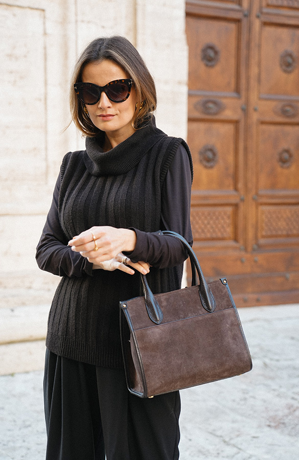 Viviana Chocolate to stylowy, kobiecy golf bez rękawów w głębokim odcieniu czekolady — idealny na nadchodzący sezon jesienno‑zimowy jako modułowa warstwa lub samodzielny top. Wykonany z miękkiej mieszanki wełny, wiskozy i kaszmiru, zapewnia podwójne ciepło i wyjątkowy komfort noszenia. Model wyróżnia się pionowymi dzianinowymi pasami, które optycznie wydłużają sylwetkę i dodają elegancji. Można go nosić bezpośrednio na gołe ciało — nie gryzie, jest przyjemny w dotyku i pięknie układa się na figurze. Viviana Chocolate łączy funkcjonalność z wyrafinowanym stylem, sprawdzając się zarówno w codziennych stylizacjach, jak i w bardziej eleganckich zestawach. To nowość w Roselle i w kolekcji Le Cose Belle, która z pewnością stanie się ulubieńcem tego sezonu.