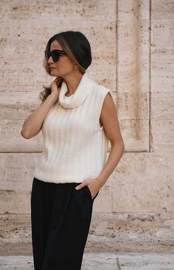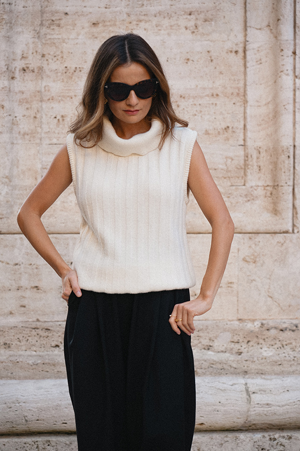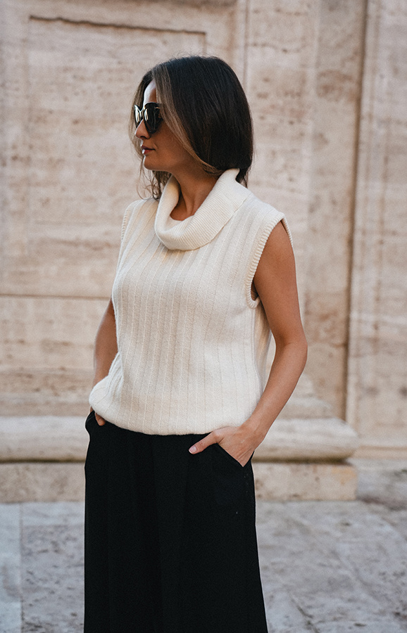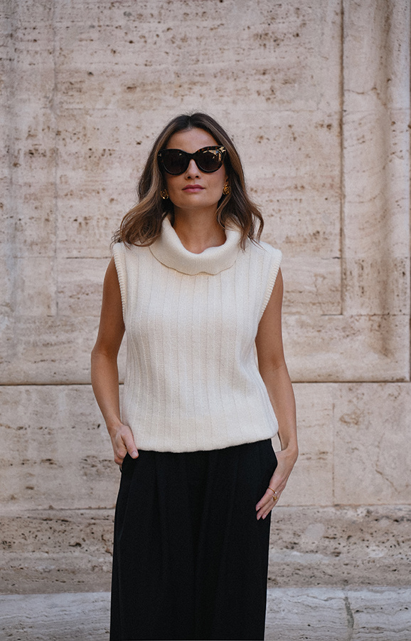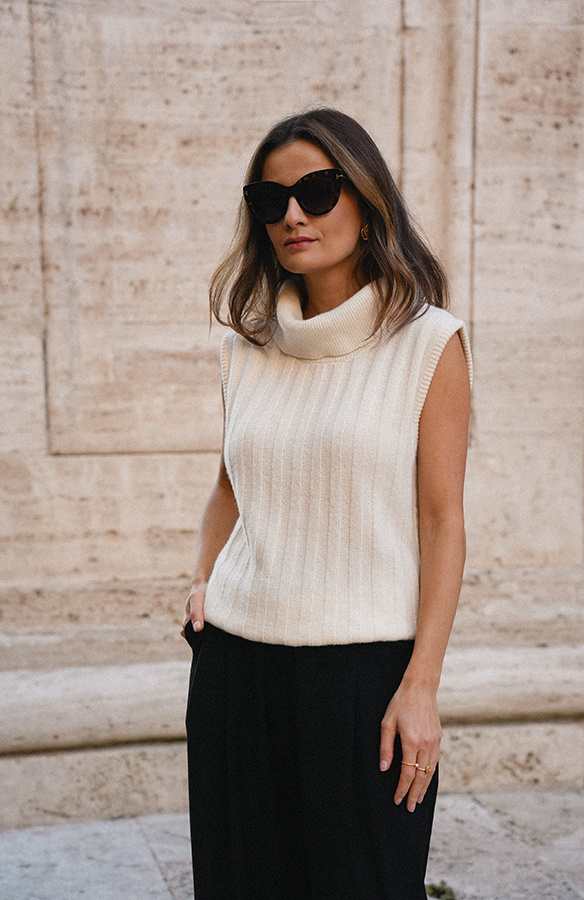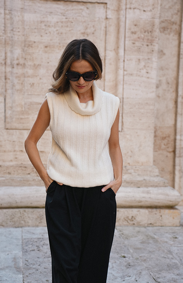 Viviana Crème to stylowy, kobiecy golf bez rękawów w subtelnym, kremowym odcieniu — idealny na sezon jesienno-zimowy jako modułowa warstwa lub samodzielny top. Wykonany z miękkiej mieszanki wełny, wiskozy i kaszmiru, zapewnia podwójne ciepło i wyjątkowy komfort noszenia. Model wyróżnia się pionowymi dzianinowymi pasami, które optycznie wydłużają sylwetkę i dodają elegancji. Można go nosić bezpośrednio na gołe ciało — nie gryzie, jest przyjemny w dotyku i pięknie układa się na figurze. Viviana Crème łączy funkcjonalność z wyrafinowanym stylem, sprawdzając się zarówno w codziennych stylizacjach, jak i w bardziej eleganckich zestawach. Nowość w Roselle i w kolekcji La Cose Belle, która z pewnością stanie się ulubieńcem tego sezonu.