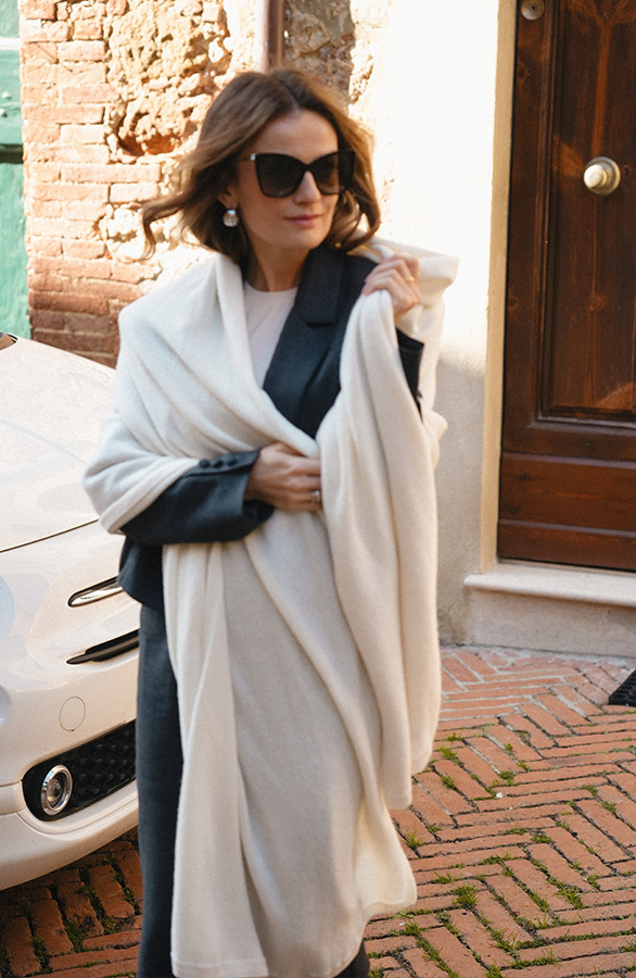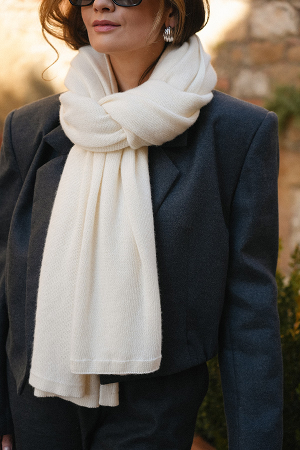 Nowość w kolekcji Roselle. Szal Clarissa Crème to połączenie wełny, wiskozy i kaszmiru, które zapewnia wyjątkową miękkość, ciepło i komfort noszenia. Jego delikatny kremowy odcień dodaje stylizacji subtelności i elegancji, idealnie wpisując się w jesienno-zimową paletę. To niezwykle ciepły i otulający model, doskonały na chłodniejsze dni. Świetnie komponuje się z płaszczem Carlotta, a także tworzy harmonijną, kobiecą stylizację z kamizelką Giovanna Crème. Można go nosić klasycznie — do płaszcza, jako stylowy akcent outfitu, ale również jako ciepłe okrycie w biurze czy w podróży. Clarissa Crème to szal, który łączy funkcjonalność z ponadczasowym stylem — idealny dodatek do codziennej elegancji.