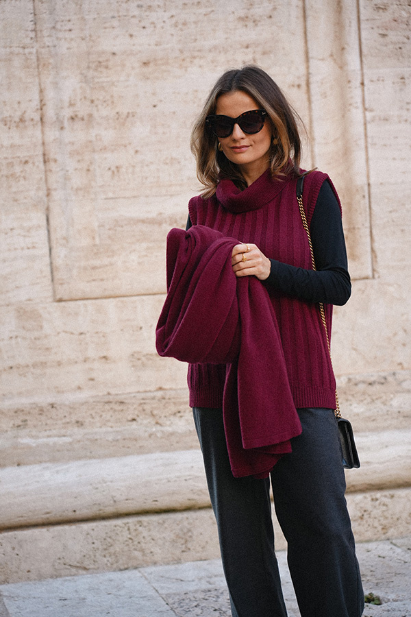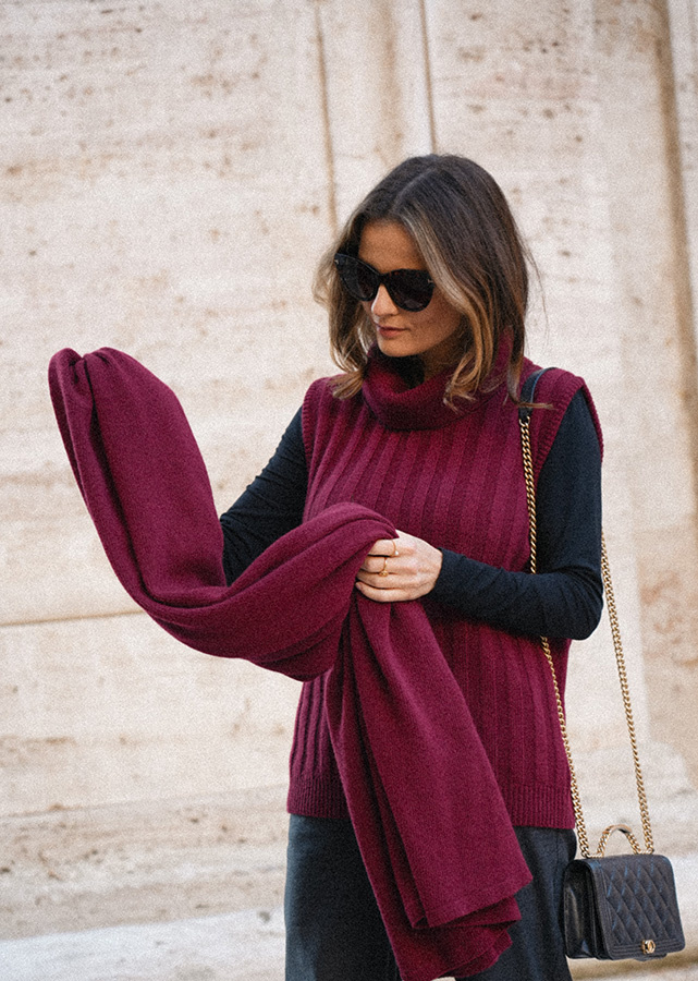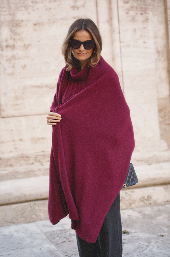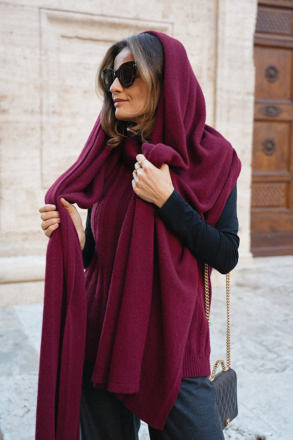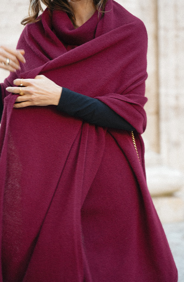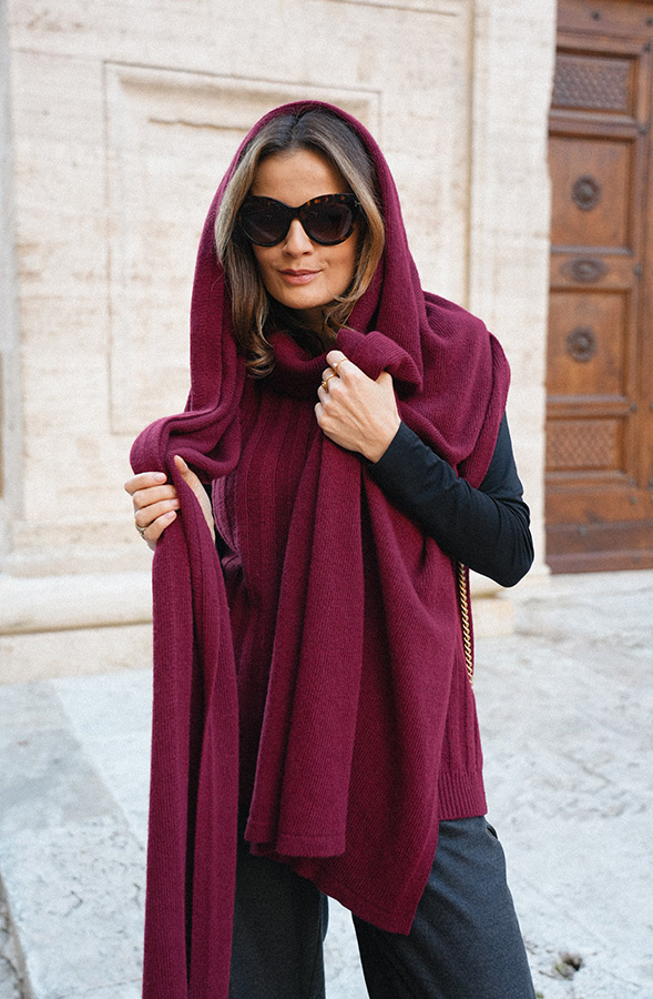 Clarissa Vino — wełniany szal z kaszmirem w kolorze toskańskiego wina. Nowość w kolekcji Roselle. Szal Clarissa Vino to połączenie wełny, wiskozy i kaszmiru, które zapewnia wyjątkową miękkość, ciepło i komfort noszenia. Jego głęboki odcień czerwonego wina dodaje stylizacji wyrazistości i elegancji. To niezwykle ciepły i otulający model, idealny na chłodniejsze dni. Świetnie komponuje się z płaszczem Carlotta, a także tworzy spójną, kobiecą stylizację z kamizelką Giovanna Vino. Można go nosić klasycznie — do płaszcza, jako stylowy akcent outfitu, ale również jako ciepłe okrycie w biurze czy w podróży. Clarissa Vino to szal, który łączy funkcjonalność z ponadczasowym stylem — idealny dodatek do jesienno-zimowej garderoby.