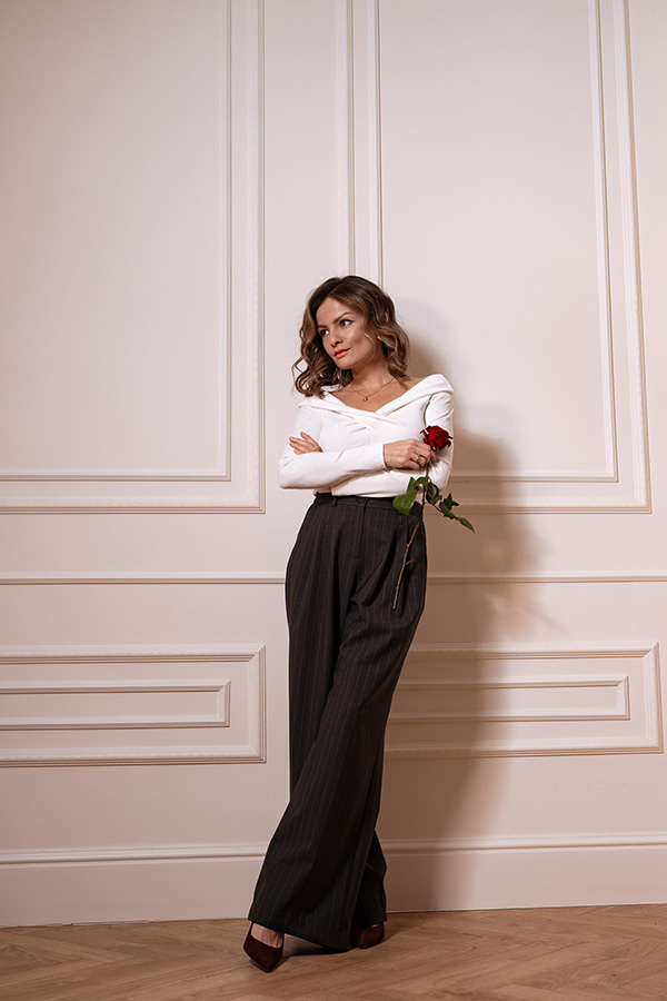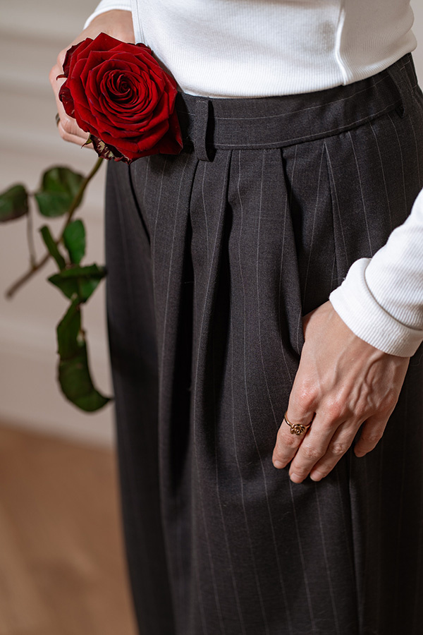Spodnie palazzo Stella Linea powracają w nowej odsłonie — tym razem w eleganckim grafitowym kolorze z jaśniejszymi, subtelnymi pasami. Zachwycają wyglądem, komfortem i idealnie wpisują się w aktualne trendy. Szerokie nogawki to jeden z najgorętszych modowych kierunków, a w połączeniu z wysokim stanem, kieszeniami, połowiczną gumą w pasie i garniturowym wykończeniem nadają spodniom nowoczesnego, wyrafinowanego charakteru. Uszyte z wysokogatunkowej włoskiej wełny z dodatkiem bambusa, są idealne na każdy dzień i świetnie współgrają z różnymi rodzajami obuwia — od sportowych sneakersów, przez mokasyny, aż po klasyczne szpilki. To model, który łączy wygodę, elegancję i ponadczasowy styl.