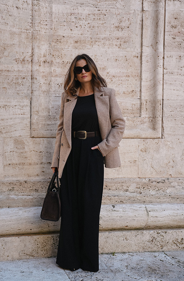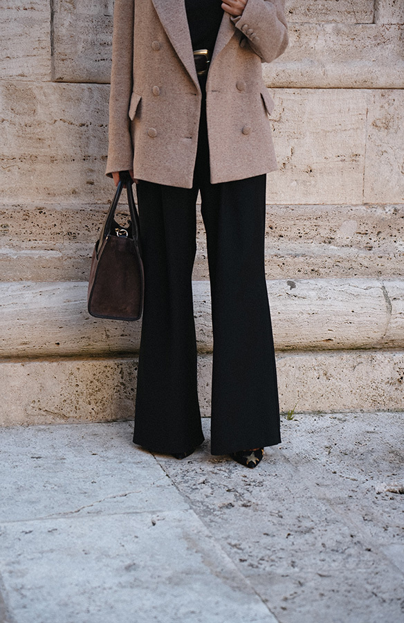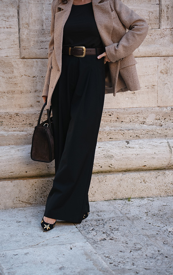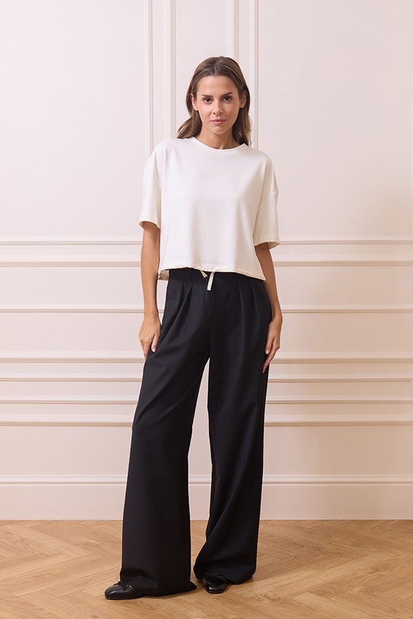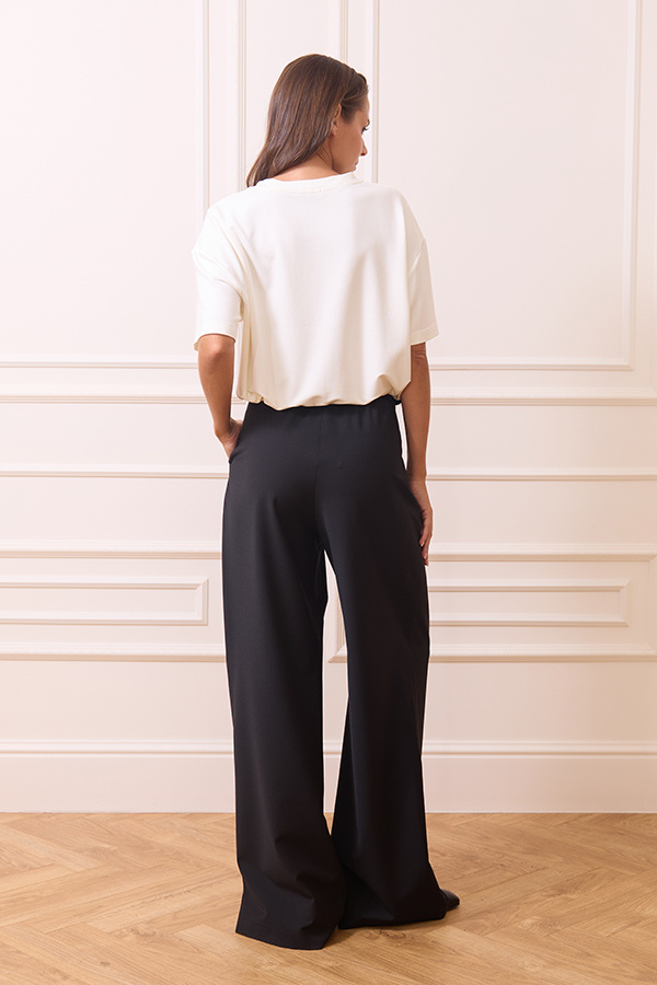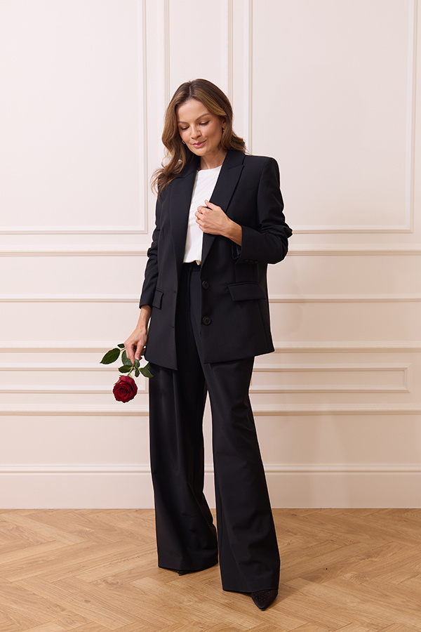 Spodnie palazzo tym razem w klasycznej czerni. Stella Noire nie tylko zachwycają swoim wyglądem i komfortem, ale także idealnie wpisują się w aktualne trendy modowe. Szerokie nogawki to jeden z najgorętszych trendów, a w połączeniu z wysokim stanem, kieszeniami, połowiczną gumą w pasie i garniturowym wykończeniem nadają spodniom niepowtarzalnego uroku i nowoczesnego stylu. Spodnie uszyte z wysokogatunkowej włoskiej wełny, idealne na każdy dzień i do każdego rodzaju butów - sportowych, mokasynów, czy klasycznych szpilek.