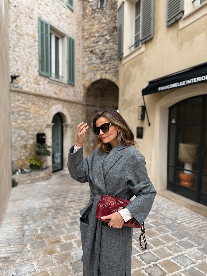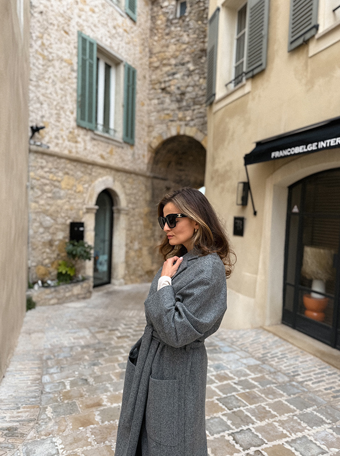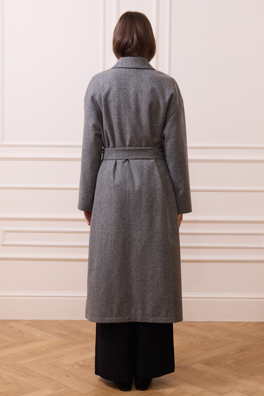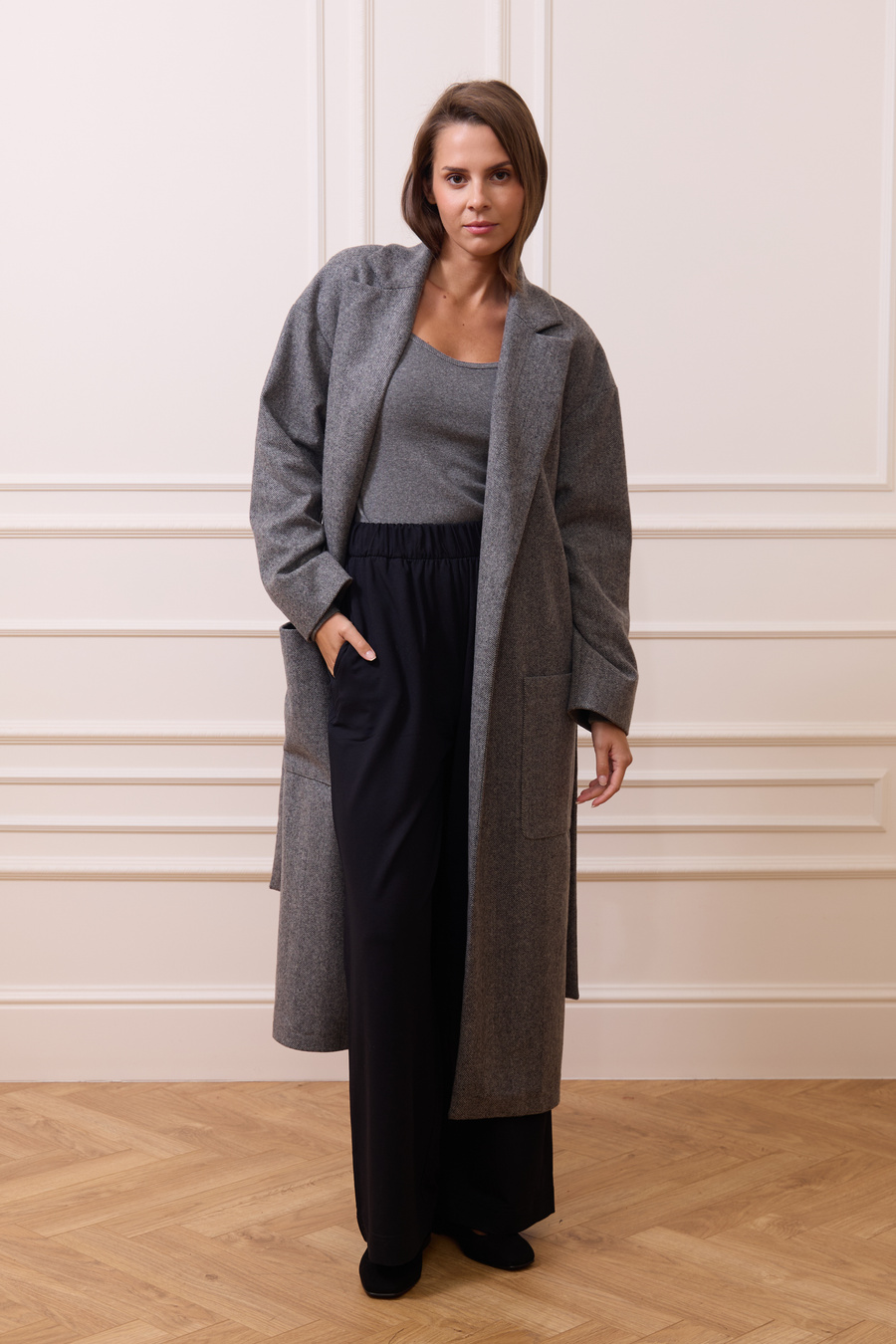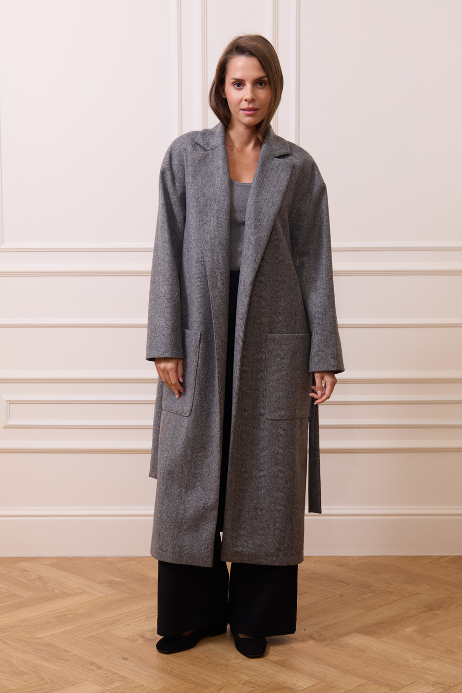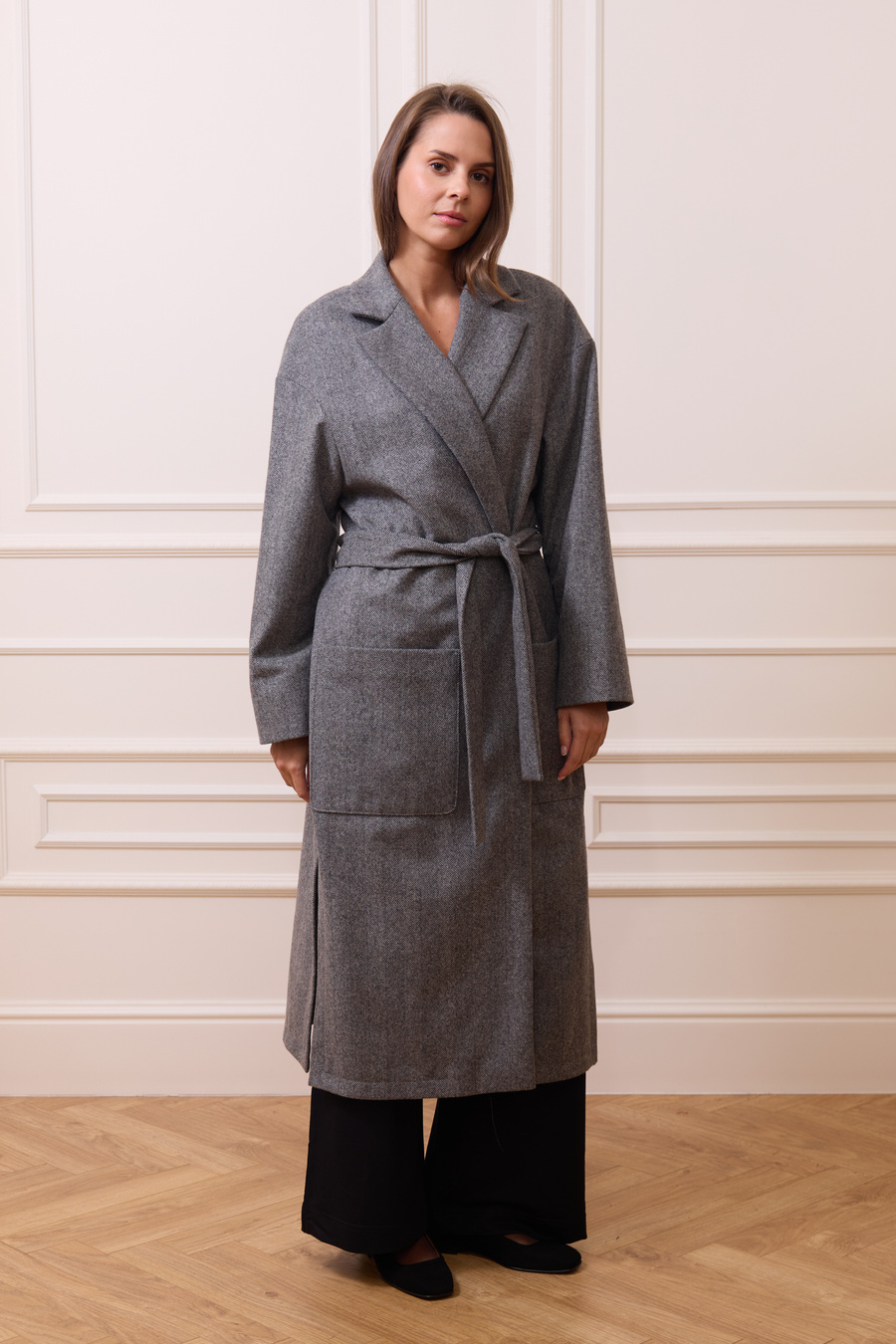 Chic de la Rue — elegancja w najczystszej formie. Długi płaszcz bez zapięcia, wykonany z najwyższej jakości włoskiej wełny, to ponadczasowy model, który sprawdzi się w każdej stylizacji — od codziennej po bardziej formalną. Charakterystyczny wzór jodełki w odcieniu szlachetnej szarości to klasyka jesienno-zimowej garderoby. Dwie głębokie kieszenie i szeroki pas pozwalają podkreślić talię i nadać sylwetce wyrazistości. Lekko opuszczone ramię zapewnia komfort noszenia i doskonale sprawdza się w warstwowych zestawieniach. Chic de la Rue to inwestycja w styl, który nie przemija.