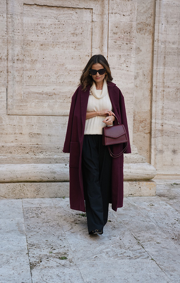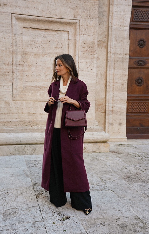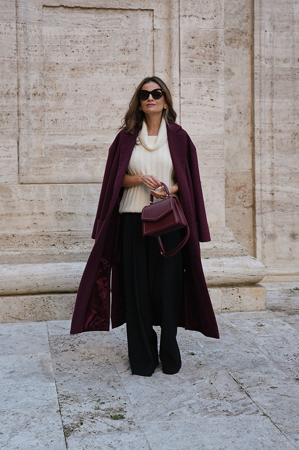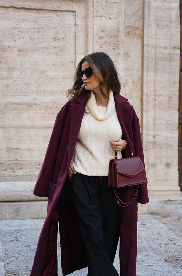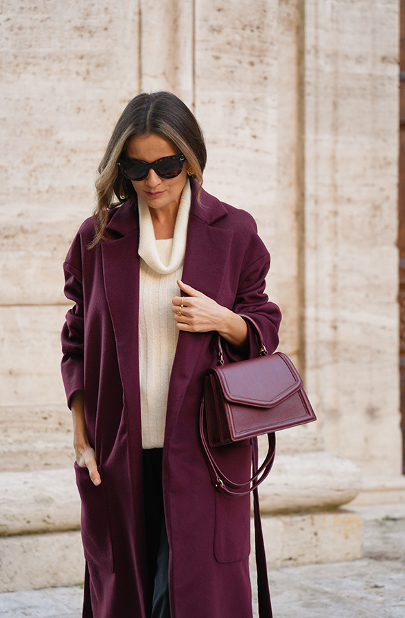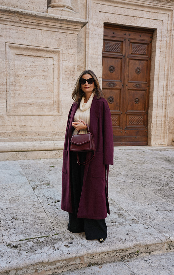 Chic de la rue Bordeaux — kultowy, długi płaszcz powraca w nowej odsłonie kolekcji Le Cose Belle. Uszyty z najwyższej jakości włoskiej wełny i kaszmiru, zachwyca ponadczasowym fasonem i niezwykle modnym odcieniem głębokiego bordo. Model posiada dwie głębokie kieszenie oraz szeroki pas, dzięki któremu można pięknie wymodelować sylwetkę. Lekko opuszczone ramię sprawia, że płaszcz jest wygodny i świetnie nadaje się do warstwowych stylizacji. To klasyk jesienno‑zimowej garderoby, który z powodzeniem uzupełni zarówno eleganckie, jak i codzienne zestawy.