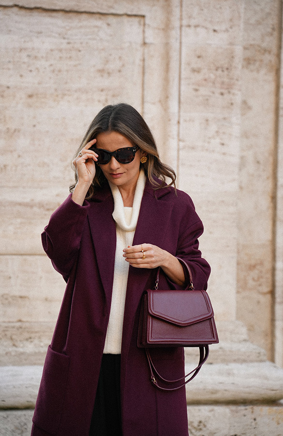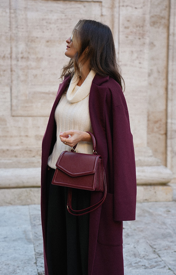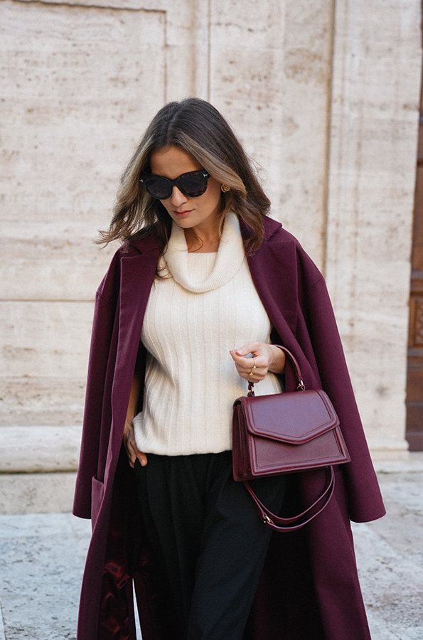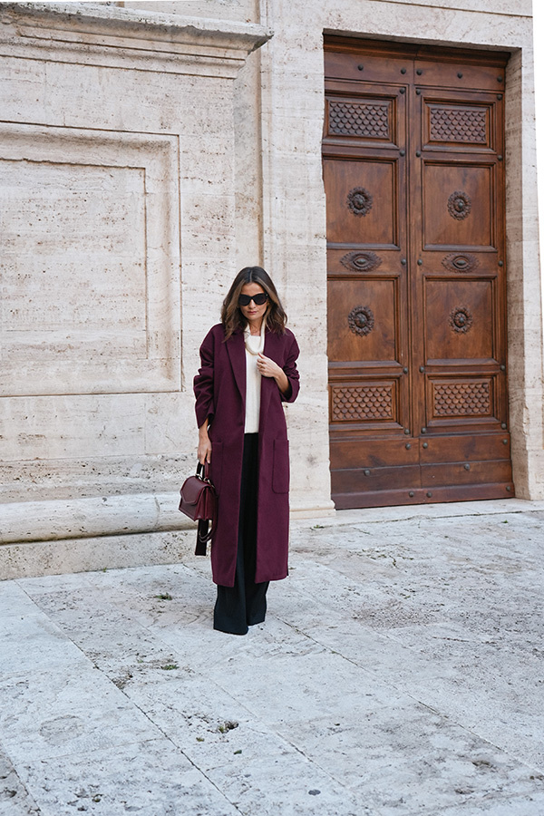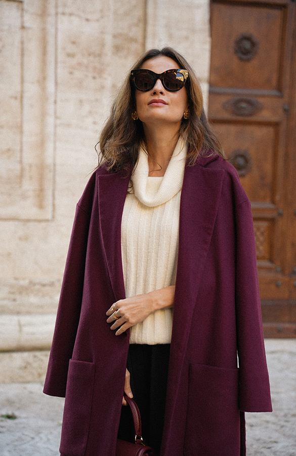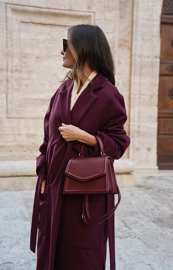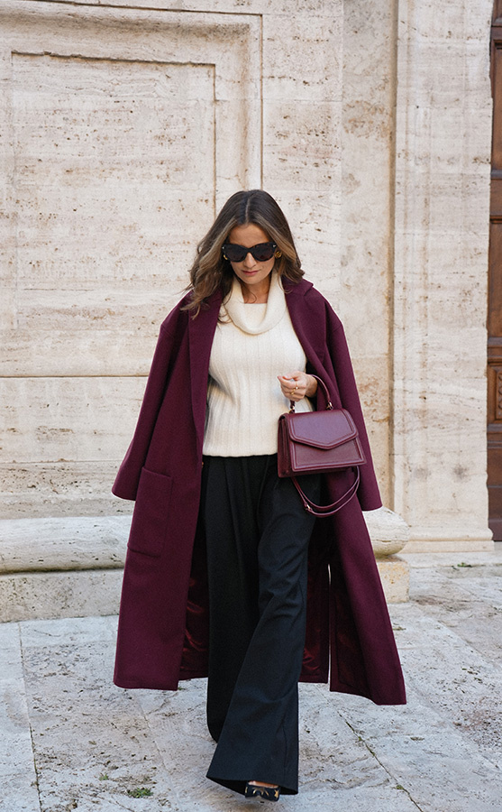 Chic de la rue Bordeaux — kultowy, długi płaszcz powraca w nowej odsłonie kolekcji Le Cose Belle. Uszyty z najwyższej jakości włoskiej wełny i kaszmiru, zachwyca ponadczasowym fasonem i niezwykle modnym odcieniem głębokiego bordo. Model posiada dwie głębokie kieszenie oraz szeroki pas, dzięki któremu można pięknie wymodelować sylwetkę. Lekko opuszczone ramię sprawia, że płaszcz jest wygodny i świetnie nadaje się do warstwowych stylizacji. To klasyk jesienno‑zimowej garderoby, który z powodzeniem uzupełni zarówno eleganckie, jak i codzienne zestawy.