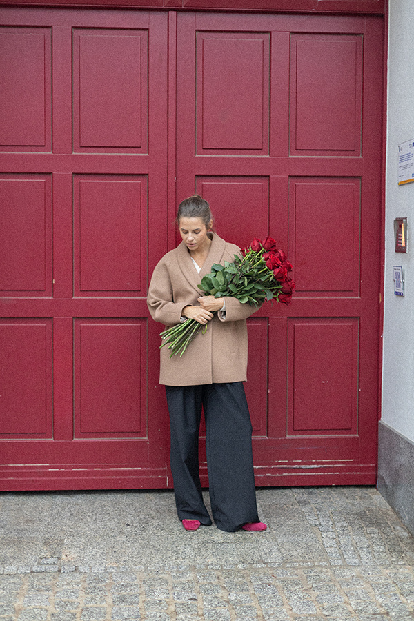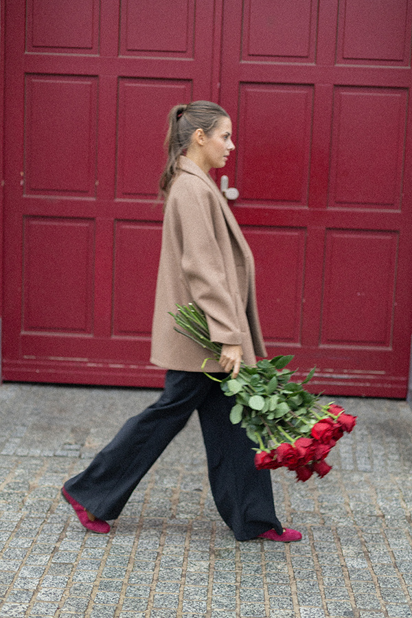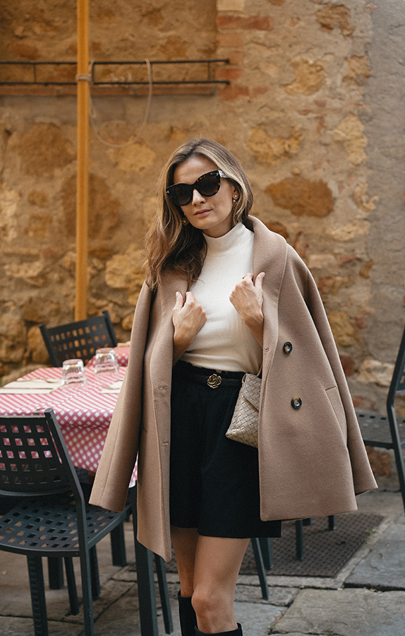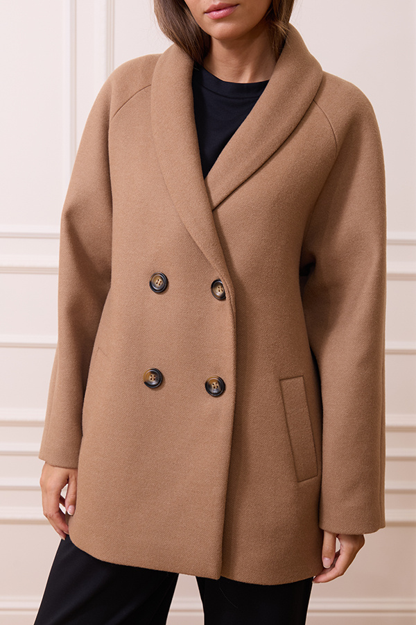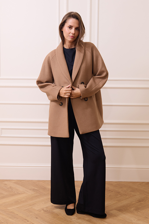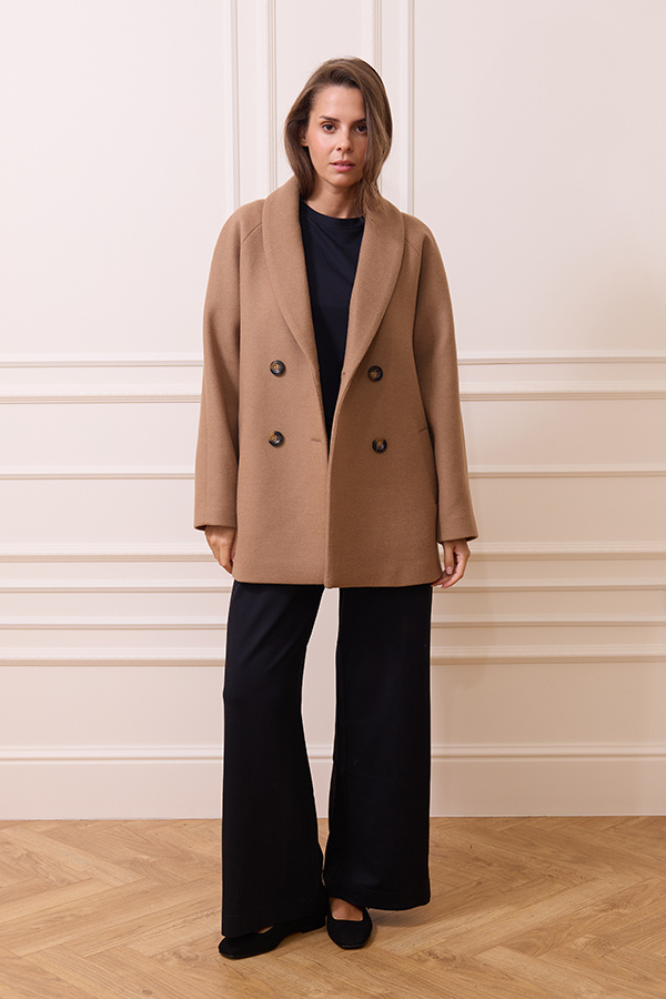 Nowość w Roselle. Klasyczny, krótki płaszcz uszyty z miękkiej, włoskiej wełny. Posiada lekko oversizowy fason z obniżoną linią ramion, dzięki czemu swobodnie mieści marynarki, bluzy czy grubsze swetry, nie tracąc eleganckiego charakteru. Prosty krój został uzupełniony włoskimi guzikami, a jasny karmelowy odcień dodaje lekkości i łatwo łączy się z innymi elementami garderoby.