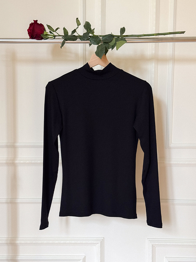 Ginny Noire — otulający półgolf w kolorze czarnym. Dopasowany półgolf z krótkim rękawem, wykonany z miękkiej wiskozy z dodatkiem elastanu, to esencja kobiecego komfortu. Materiał pięknie układa się na sylwetce, subtelnie ją podkreślając i zapewniając przyjemność noszenia przez cały dzień. Ginny Noire sprawdzi się zarówno w minimalistycznych, jak i bardziej wyrazistych stylizacjach. To uniwersalna baza, która odnajdzie się w każdej garderobie.