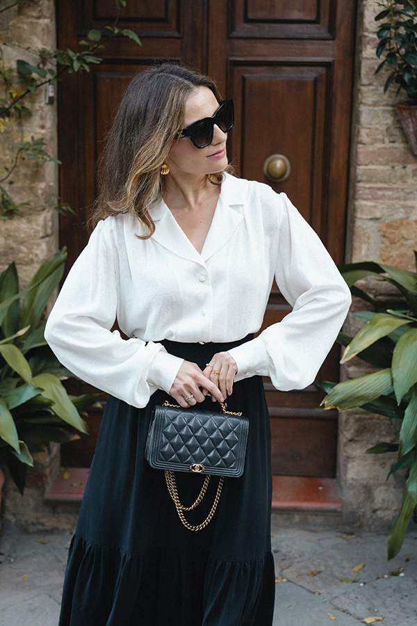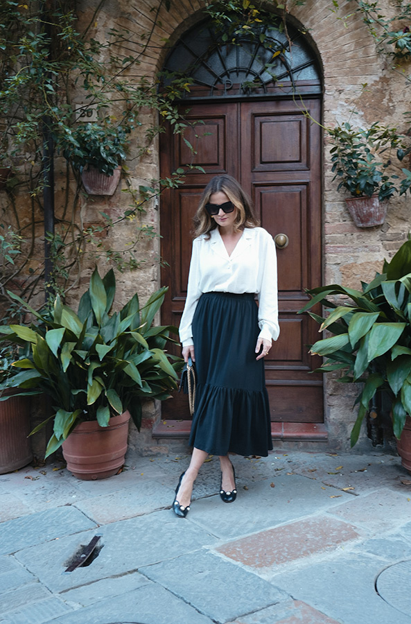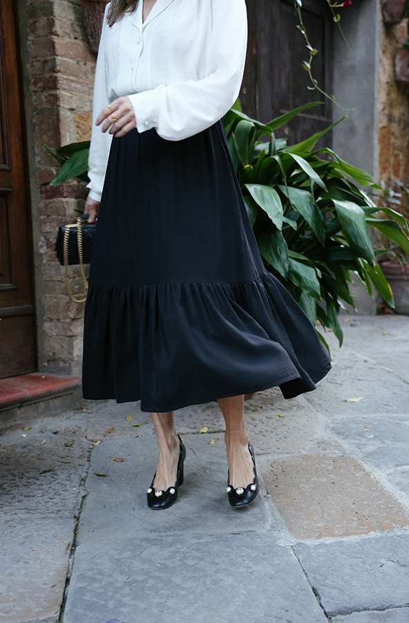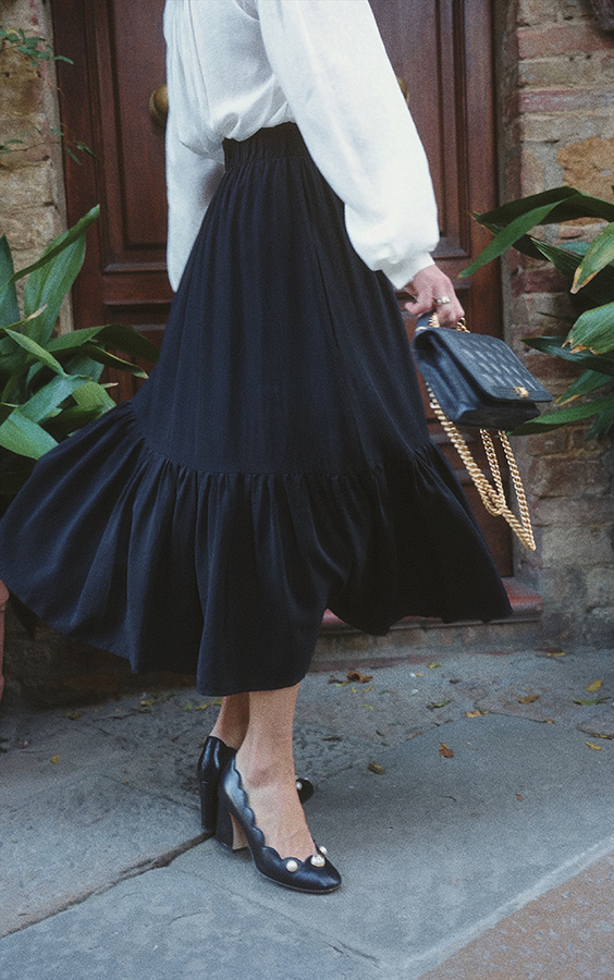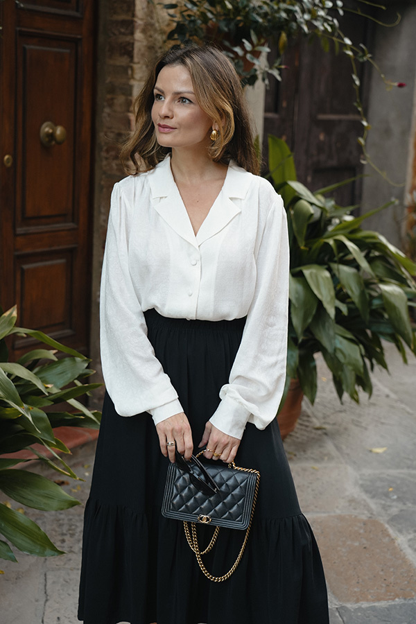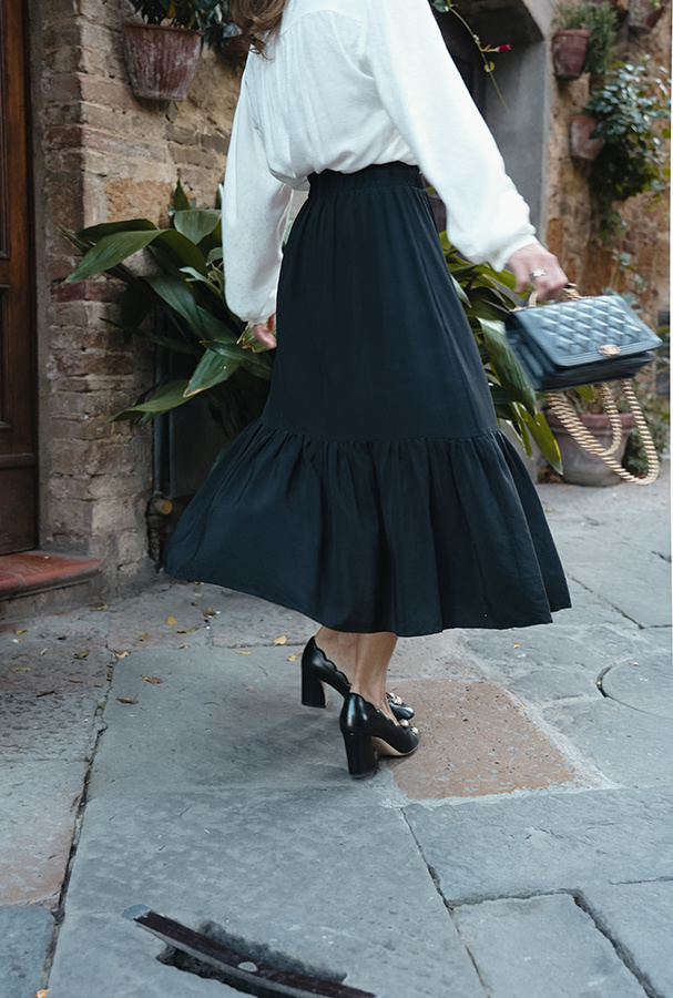 La Bohème Noire to szykowna i romantyczna spódnica midi, która ponownie pojawia się w ofercie Roselle. Wykonana z włoskiego matowego jedwabiu w klasycznej czerni, zachwyca lekkością, elegancją i ponadczasowym charakterem. Model posiada dwie boczne kieszenie oraz komfortową, elastyczną gumę w pasie, dzięki czemu doskonale dopasowuje się do sylwetki. Delikatnie rozkloszowany dół zakończony falbaną pięknie faluje przy każdym ruchu, dodając kobiecego wdzięku. La Bohème Noire możesz wystylizować na wiele sposobów — ze szpilkami, botkami czy sportowymi tenisówkami. To od Ciebie zależy, jaki efekt chcesz uzyskać.