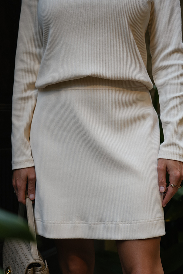Nowy model spódnicy w Roselle. Dzianinowa spódnica mini Rebecca Crème wykonana z bawełny premium, w pięknym kremowym odcieniu. Klasyczna, ponadczasowa, prążkowana dzianina o wyjątkowej strukturze. Spódnica o delikatnym fasonie w kształcie litery A będzie idealnym elementem codziennych jak i bardziej formalnych outfitów. Spódnica posiada szeroką gumkę w pasie, która zapewnia maksymalną wygodę i doskonałe dopasowanie do każdego rodzaju sylwetki.