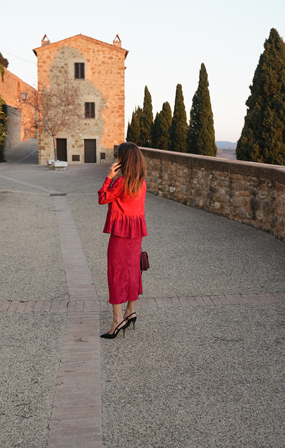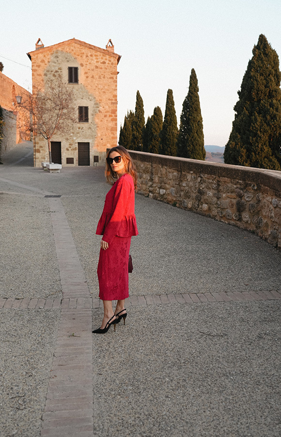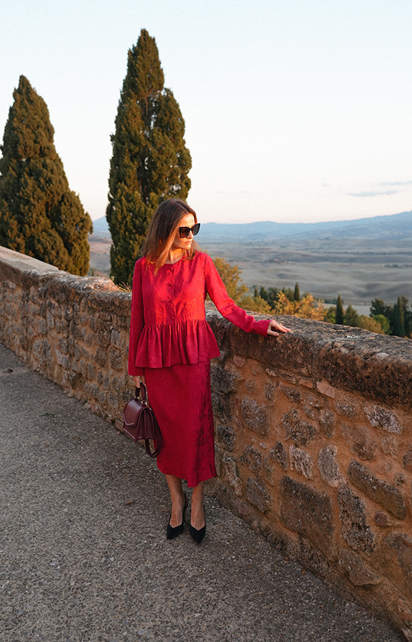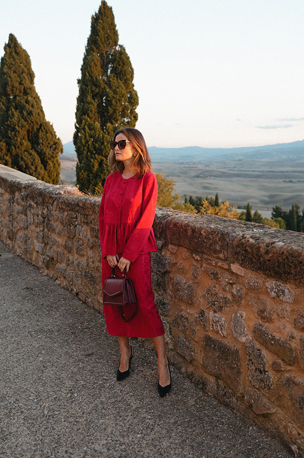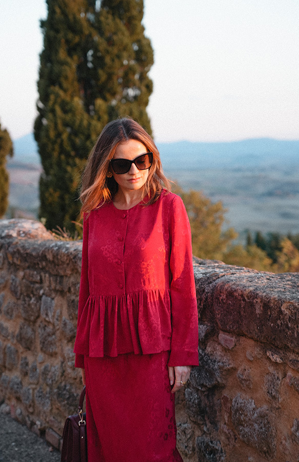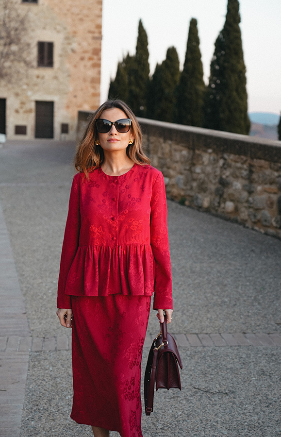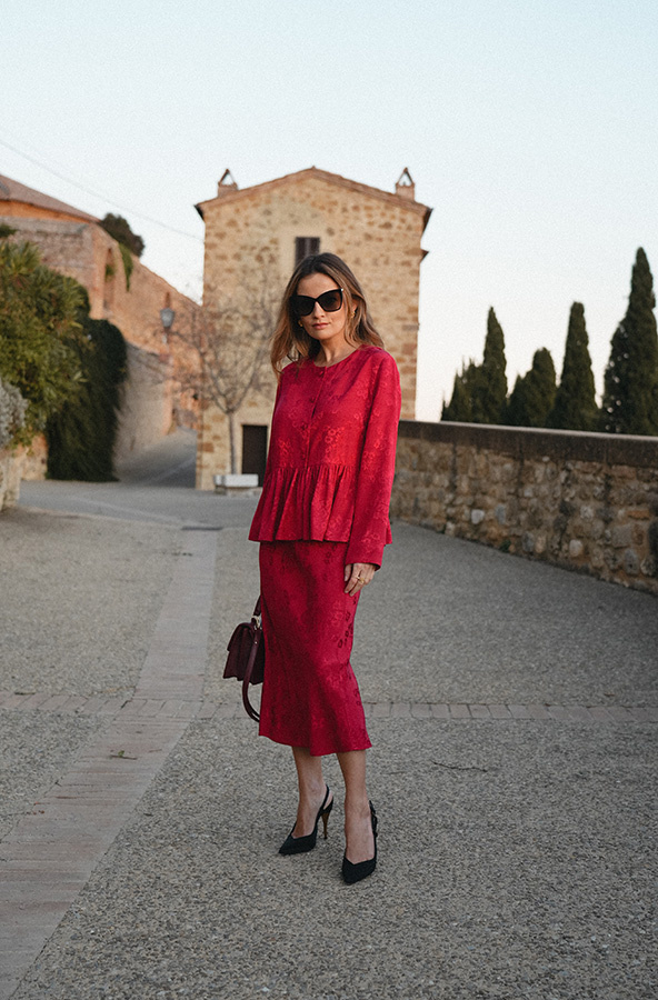 Spódnica midi Lilianne Rosso to wyjątkowy model wykonany z wiskozy, w eleganckim bordowym kolorze, ozdobiony pięknym żakardowym wzorem. Jej niepowtarzalny charakter sprawia, że doskonale wzbogaca kolekcję Le Cose Belle, w pełni oddając znaczenie tych słów – piękne rzeczy. To spódnica, która zachwyca zarówno formą, jak i materiałem, tworząc ponadczasowy element jesienno‑zimowej garderoby. Najpiękniej prezentuje się w duecie z bluzką Valentina Rosso uszytą z tego samego materiału – razem tworzą spójną, elegancką i kobiecą stylizację.