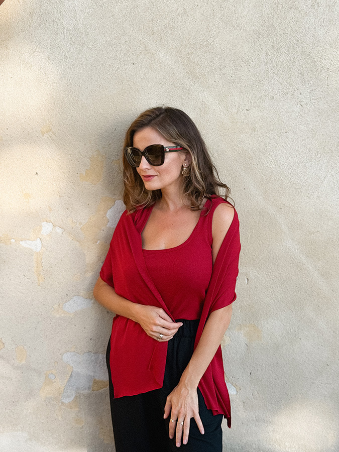 Szalik Ilaria Amour będzie idealnym dopełnieniem wielu stylizacji. Wykonany z wyjątkowej, przyjemnej dla skóry tkaniny, która jest jak druga skóra, dzięki czemu jest niezwykle otulający. Wyjątkowy kolor głębokiej czerwieni nadaje mu oryginalności. Możesz nosić go w dowolny sposób - na szyi jako apaszkę, na włosach jako ozdobę lub otulić nim ramiona.
